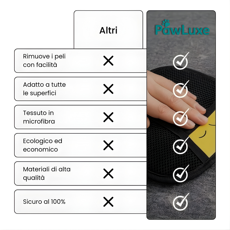 Pawluxe è facile da pulire! Basta rimuovere i peli accumulati e lavarlo sotto acqua corrente. Il design è pensato per facilitare la manutenzione, garantendo una lunga durata.